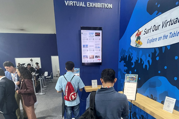 日本企業9社が、再エネ・省エネ・衛星データ利活用・ 廃棄物の再生利用等の技術の展示を行いました。ジャパン・パビリオンは日々盛況で、20カ国以上の閣僚等のハイレベルが展示視察に来場するなど、全世界に向けて、我が国の脱炭素技術等を力強く発信しました。また、オンラインでのバーチャル展示も行い、来場者は熱心にタブレットを操作して日本の技術に高い関心を示していました。