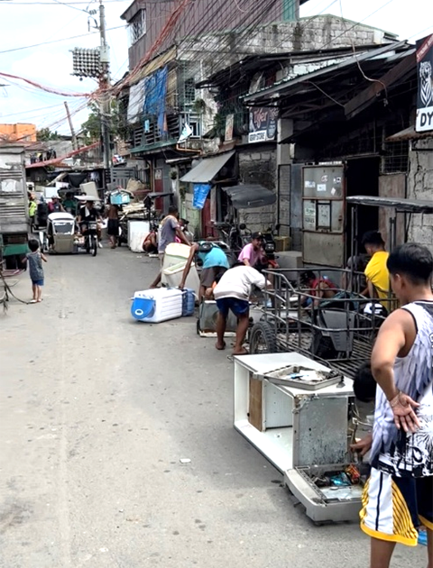 環境省調査に同行し、e-wasteⅲのリサイクルが行われている集落を訪問したことがある。一本の路地沿いにジャンクショップが立ち並び、トライシクル(三輪バイク)で次々と家電ゴミが持ち込まれてくる。興味深いのは、この数百メートルの路地の中に一つのサプライチェーンが完成している点だ。入口付近では洗濯機やエアコンの外装を外す人々が黙々と作業し、奥へ進むにつれて扱うパーツは細かくなり、最終地点では「基板がキロいくら」といった単位で買い取られていく。そこからトラックに積まれ、集落の外、最終的には中国など海外市場へと流れていく。