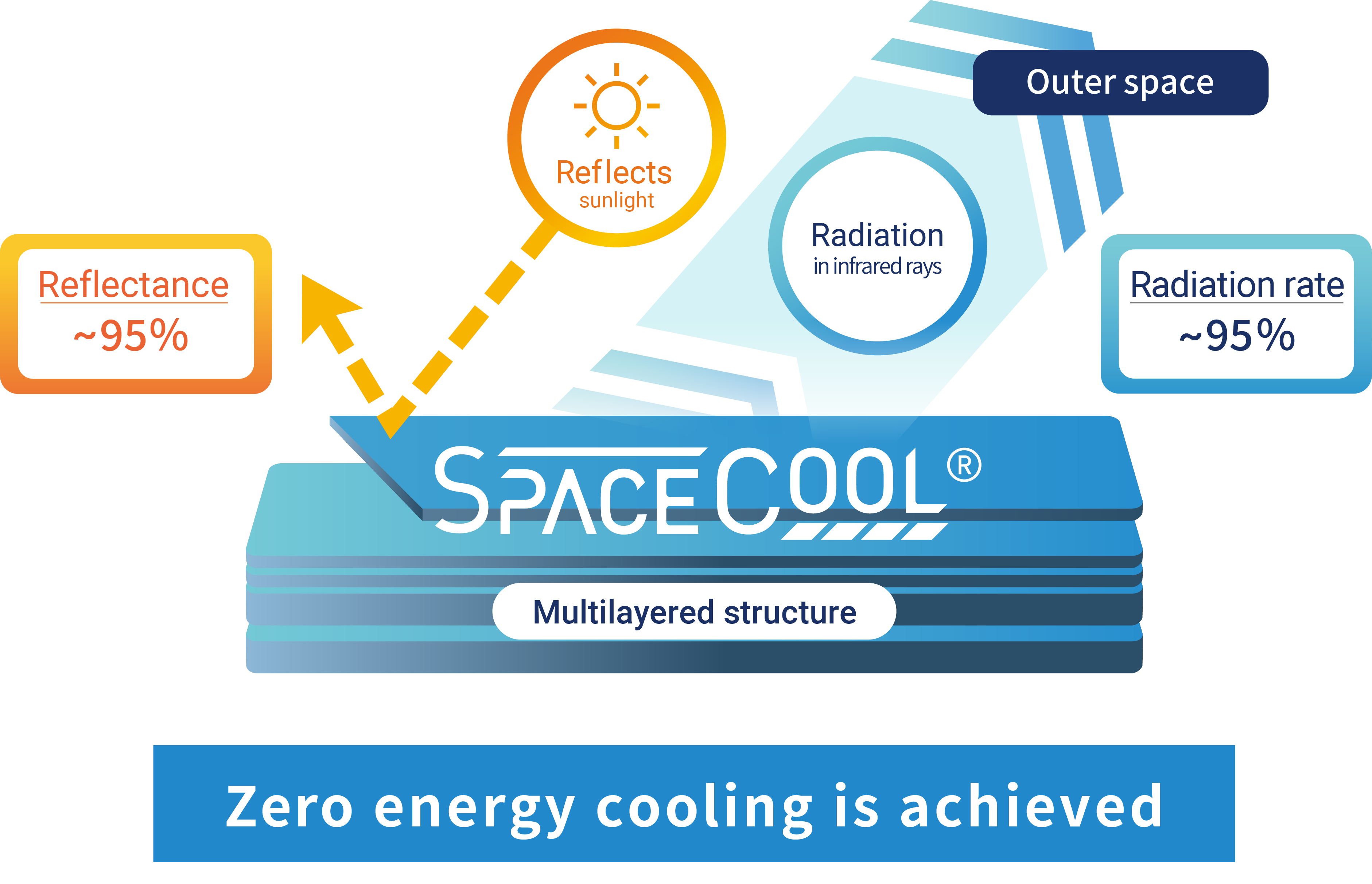 SPACECOOL INC. has developed an innovative radiative cooling material, “SPACECOOL”, that leverages natural phenomena for sustainable cooling. Reflecting about 95% of sunlight and radiating the heat back into space, it keeps surfaces cool even under direct sunlight, providing zero-energy cooling comparable to air conditioning.