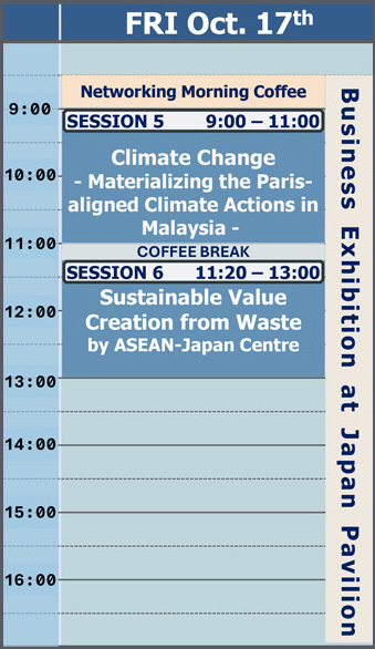 ◆ Supporting organizations:ASEAN-Japan Centre (AJC), Embassy of Japan in Malaysia, Embassy of Malaysia, Tokyo, Federation of Malaysian Manufacturing (FMM), ICLEI Japan, Japan External Trade Organization (JETRO) Kuala Lumpur Office,Japan International Cooperation Agency (JICA) Malaysia Office, Malaysian Green Technology And Climate Change Corporation (MGTC), Japan Platform for Redesign: Sustainable Infrastructure (JPRSI), Overseas Environmental Cooperation Center (OECC)