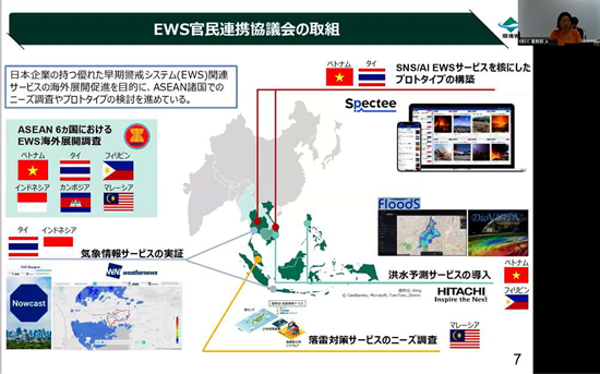 日本政府は、COP27において「日本政府の気候変動の悪影響に伴う損失及び損害(ロス&ダメージ)支援パッケージⅱ」を公表しており、そのメニューの一つとして、環境省は「アジア太平洋地域における官民連携による早期警戒システム(EWS)導入促進イニシアティブ」及びこれに基づく「EWS官民連携協議会ⅲ」を立ち上げています。同協議会の取組として、現在はASEAN諸国を対象に、日本企業が有する優れたEWS関連サービスの展開が進められていることが紹介されました。
