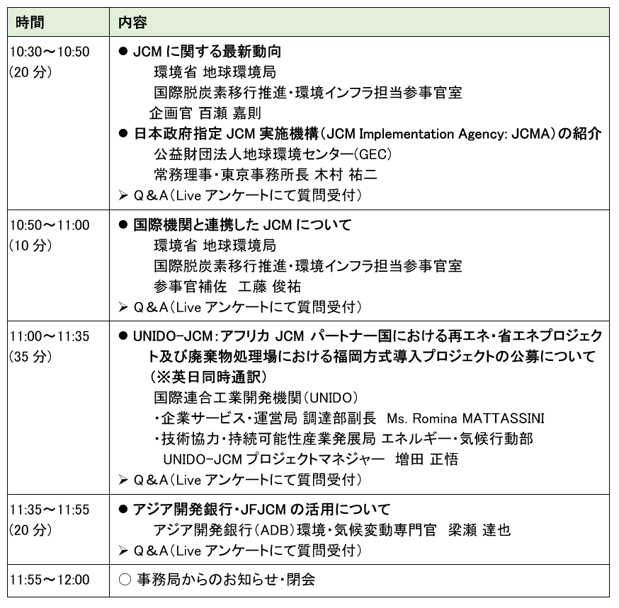 本セミナーでは、JCMに関する、現在の状況、今後の展開方策、各国政府や関係機関との調整状況など、制度を取り巻く最新動向を環境省から紹介するとともに、UNIDO及びADBそれぞれの担当者よりJCMの公募情報及び活用スキームについて発表いただきます。