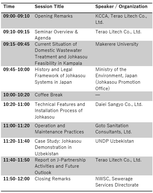 カンパラ市当局(Kampala Capital City Authority: KCCA)は、日本のテラオライテック株式会社(Terao Litech Co., Ltd.)およびマケレレ大学(Makerere University)と連携し、経済産業省(METI)による支援のもと、日本の分散型汚水処理技術「浄化槽(Johkasou)」を紹介するステークホルダーセミナーを開催します。