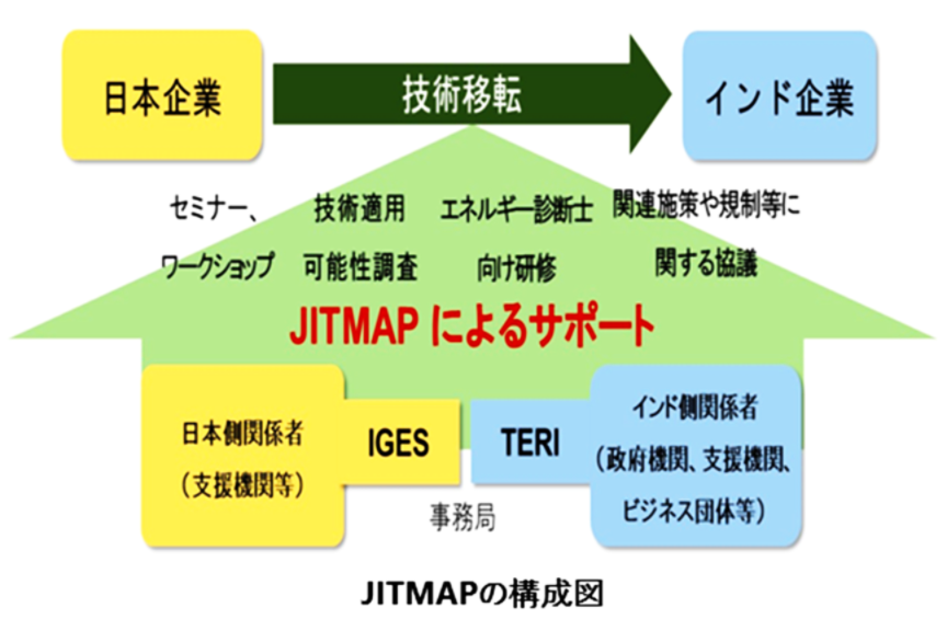 i JITMAPはIGESとTERIが事務局として、日印両国の政府関係機関・ビジネス団体等の協力関係機関等と連携し、インドにおいて日本企業の環境技術の普及を促進するための活動を実施しています。具体的には、日本企業の協力を得て、インド企業の経営幹部やエネルギー管理者、エネルギー診断⼠向けの⽇本の環境技術に関する理解を深めてもらうセミナーやワークショップ、技術の適⽤可能性及びその適用効果等を把握するための現地企業における技術適用可能性調査(FS)、さらに、技術の伝搬者となる可能性の高いエネルギー診断⼠やエネルギー管理者等を対象としたより実践的な技術研修を実施しています。