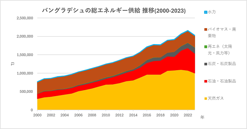 バングラデシュの経済成長に伴うエネルギー需要は急伸している。バングラデシュはかつて2000年代初頭まで、「豊富な国産天然ガス」で需要を賄えていた。しかし長年のガスセクターにおけるガバナンスの不全と開発の遅れが響き、国産ガス生産量は衰退の一途。代わりに非常に高価な液化天然ガス(LNG)の輸入と、高価でかつGHG排出係数も高い輸入石油への依存が2010年代から急増している(下図参照)。この結果、バングラデシュはエネルギー純輸入国に転じ、経済成長を続けるためには、高価な輸入エネルギーへの依存増加が避けられない体質になってきた。