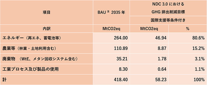 もちろん脱炭素の観点からも、エネルギーは最重要セクターである。前述のNDC 3.0では、条件付きGHG削減目標の約8割をエネルギーセクターが担っている(下表参照)。