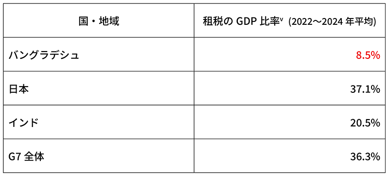 バングラデシュの租税比率は、GDPのわずか7~8%ほどに過ぎない。これは日本はじめ他の先進国はもとより、同じ南アジアのインドと比べても非常に低いことが下表から見て取れる。