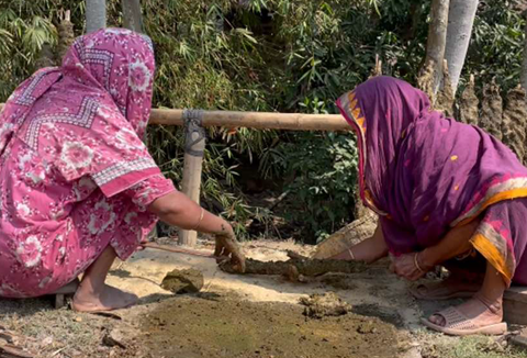 バングラデシュの農村では、多くの女性たちが、牛糞や薪を燃やして煮炊きをしており、固形バイオマス利用人口はいまだ国民の約7割に上る。一見、牧歌的な風景だが、その実態は過酷だ。これらの固形燃料は、不完全燃焼により大量のPM2.5や一酸化炭素を撒き散らす。