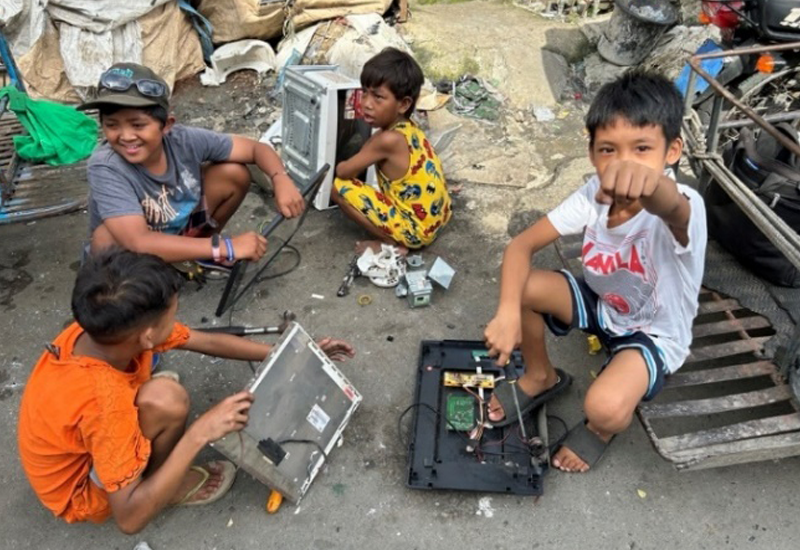 環境省調査に同行し、e-wasteⅲのリサイクルが行われている集落を訪問したことがある。一本の路地沿いにジャンクショップが立ち並び、トライシクル(三輪バイク)で次々と家電ゴミが持ち込まれてくる。興味深いのは、この数百メートルの路地の中に一つのサプライチェーンが完成している点だ。入口付近では洗濯機やエアコンの外装を外す人々が黙々と作業し、奥へ進むにつれて扱うパーツは細かくなり、最終地点では「基板がキロいくら」といった単位で買い取られていく。そこからトラックに積まれ、集落の外、最終的には中国など海外市場へと流れていく。